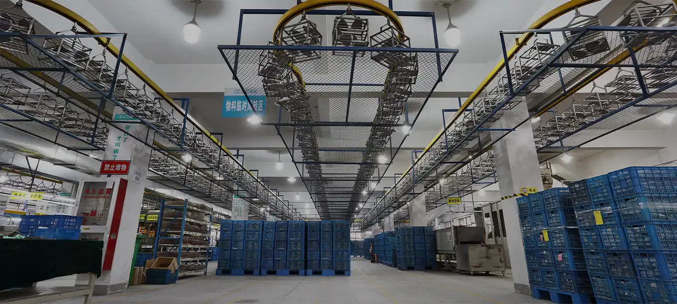 Meyitec's iron factory showcases impressive large-scale manufacturing capacity. The vast facility features rows of neatly organized workstations and machinery, interconnected by conveyor systems and overhead racks for efficient material handling.